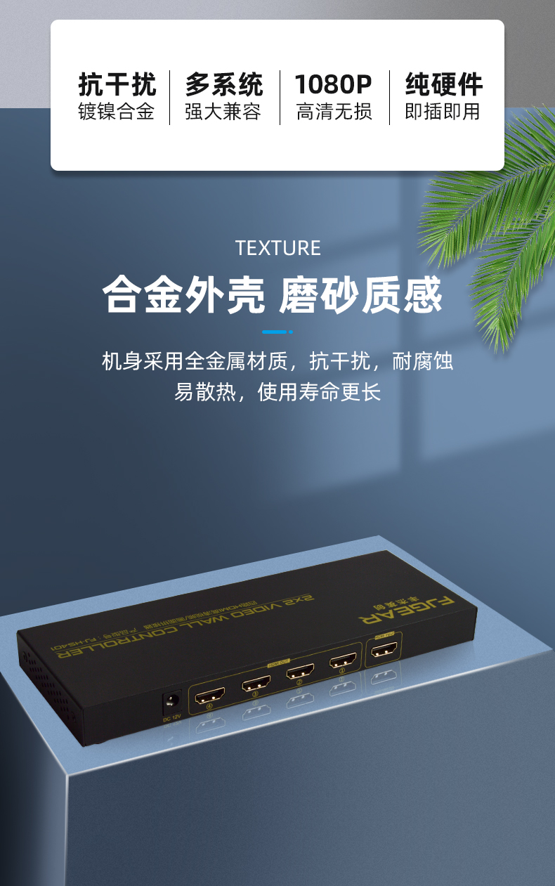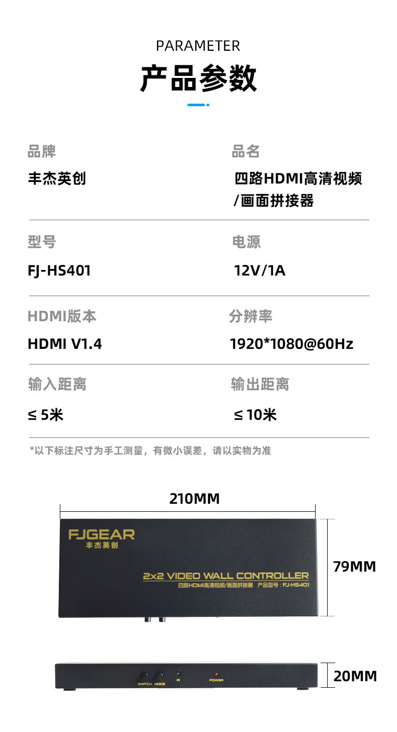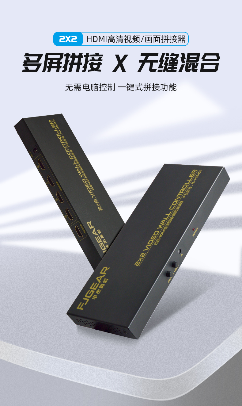FJ-HS401產品是一款四路HDMI高清視頻/畫面拼接器,由1路HDMI高清視頻信號輸入到拼接器,拼接器對視