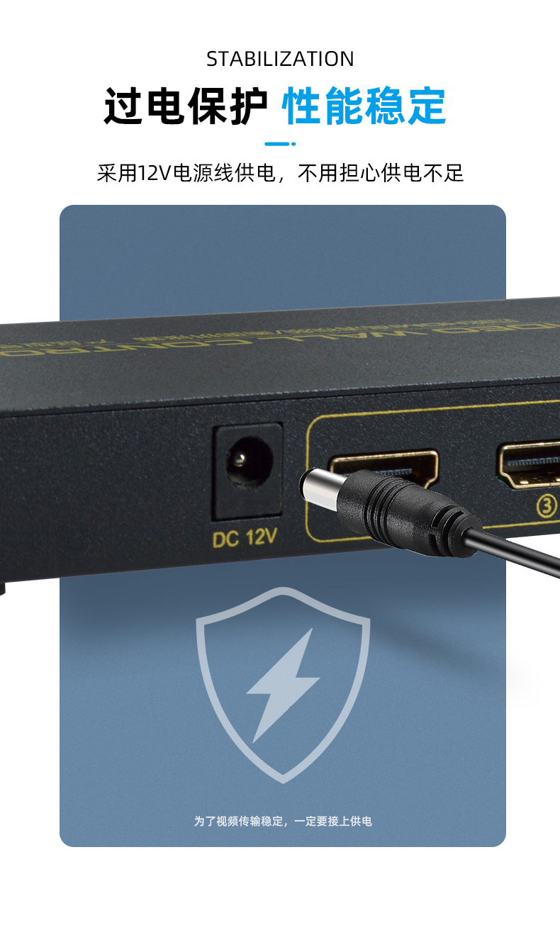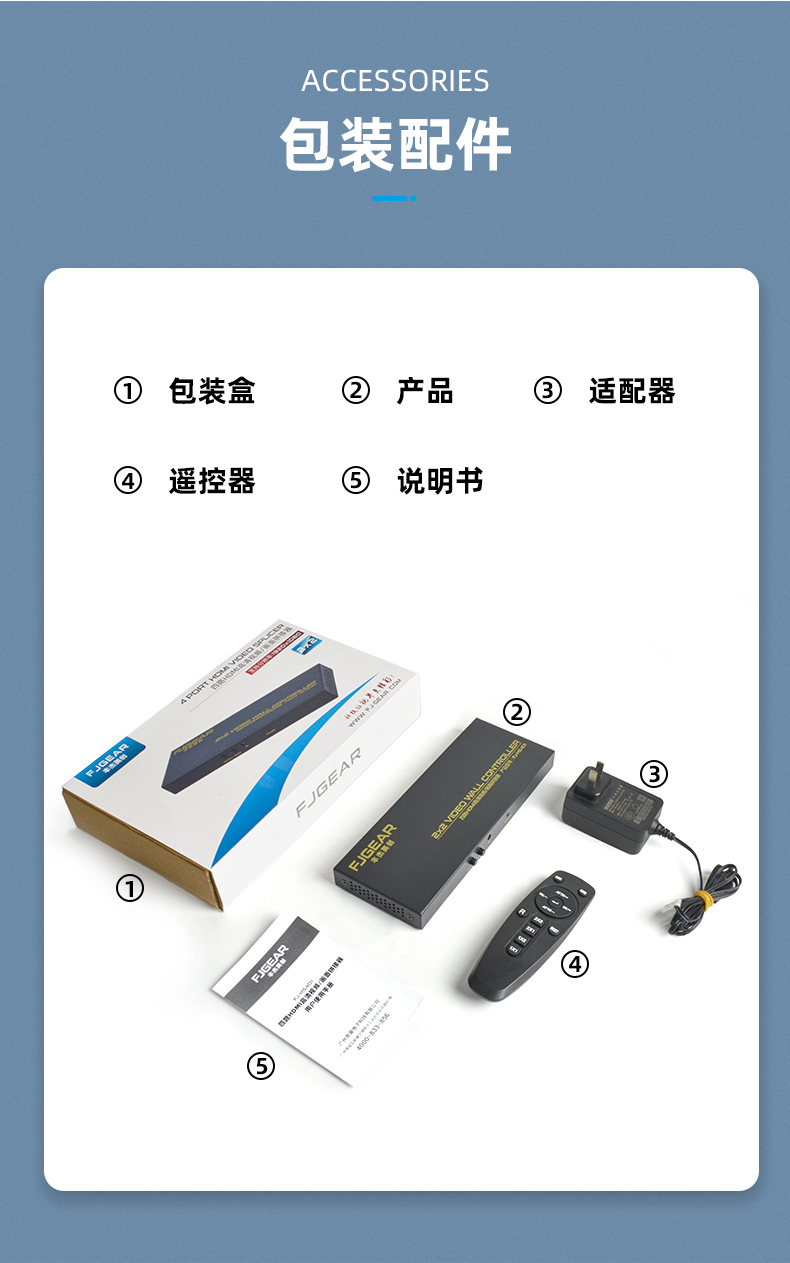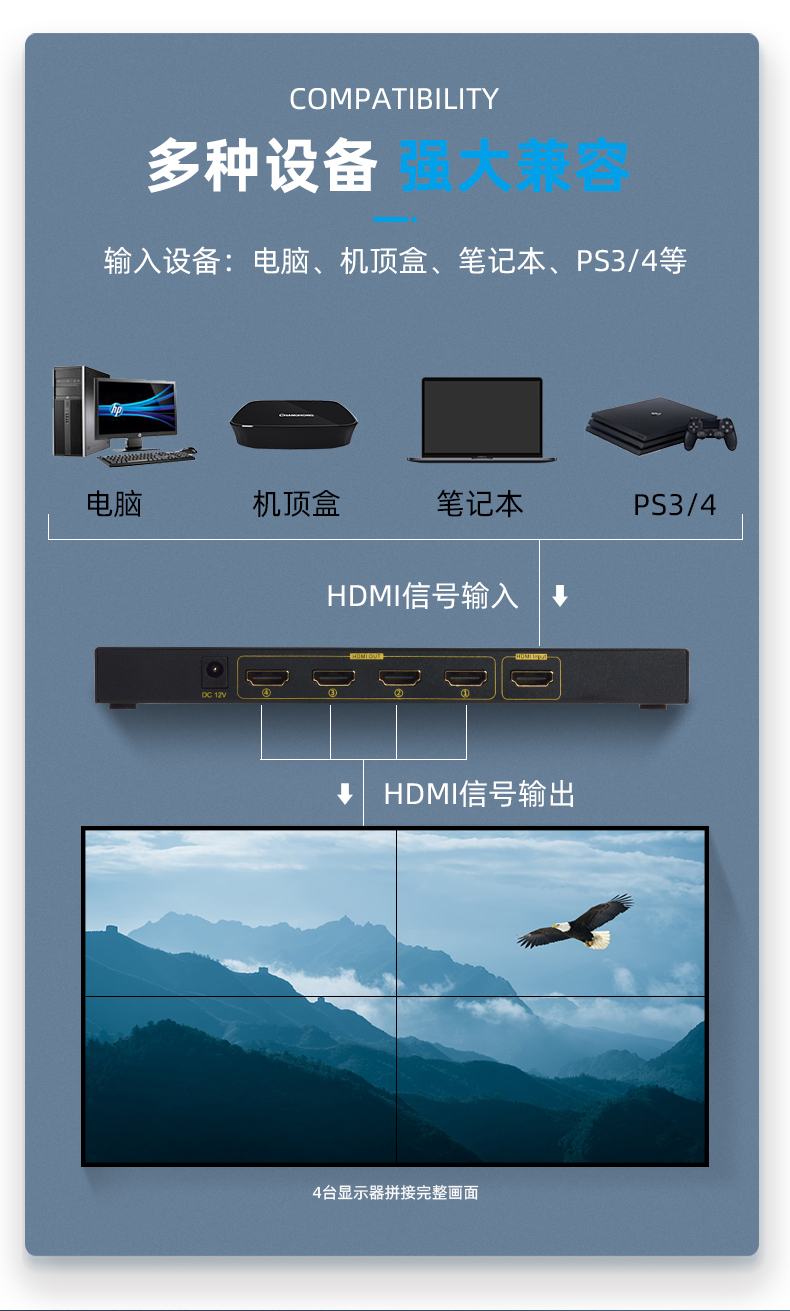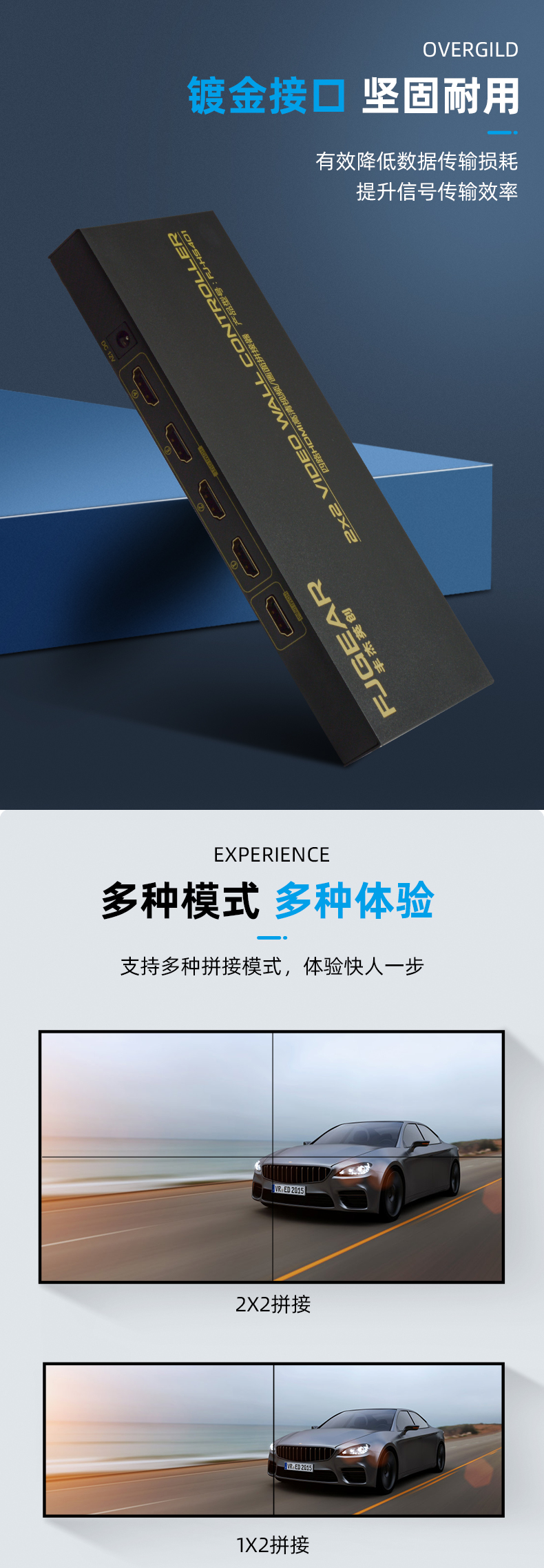 FJ-HS401產品是一款四路HDMI高清視頻/畫面拼接器,由1路HDMI高清視頻信號輸入到拼接器,拼接器對視