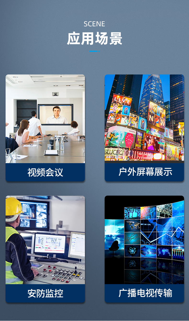 頻處理后輸出并傳輸到用戶指定的1-4個顯示屏上,拼接起來即可組合成一個大型顯示屏,具有畫質清晰,響應速度