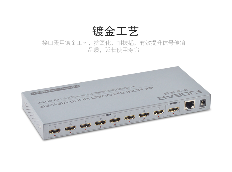 這是一款八路HDMI超清畫面分割器,它將八路HDMI信號(hào)以單獨(dú)或組合的形式顯示在同一個(gè)顯示器上面,可在分割器上自由控制