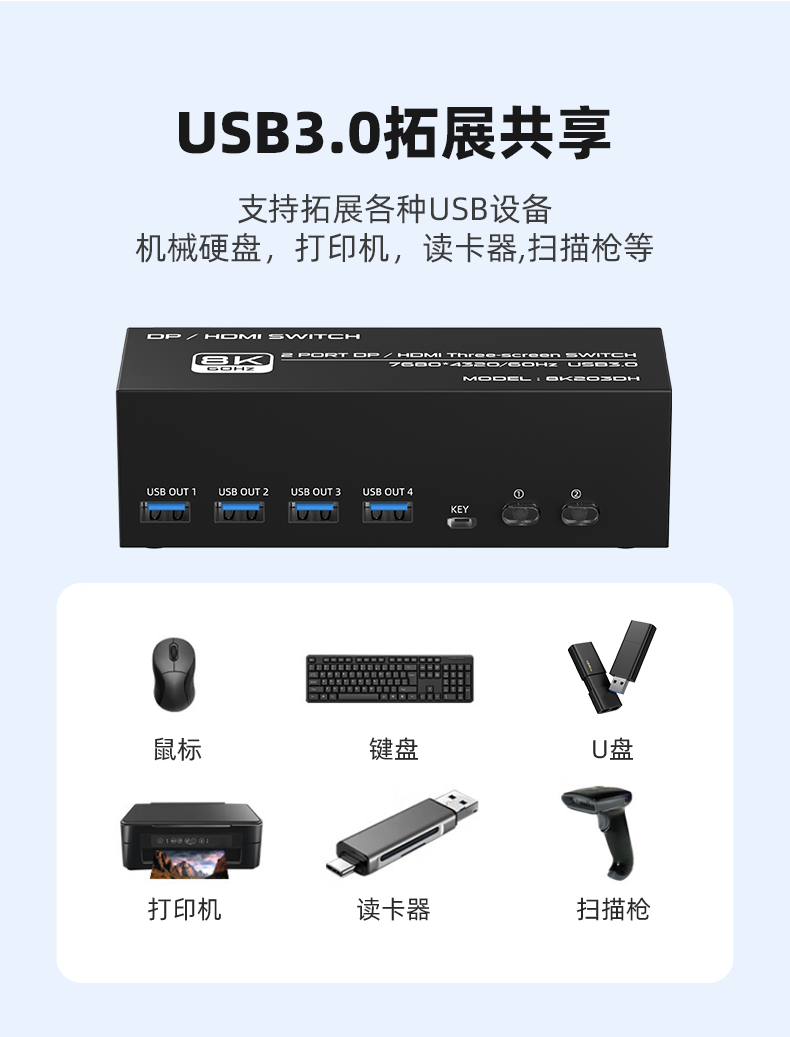 5.輸入接口:USB3.0*2+DP*4+HDMI*2