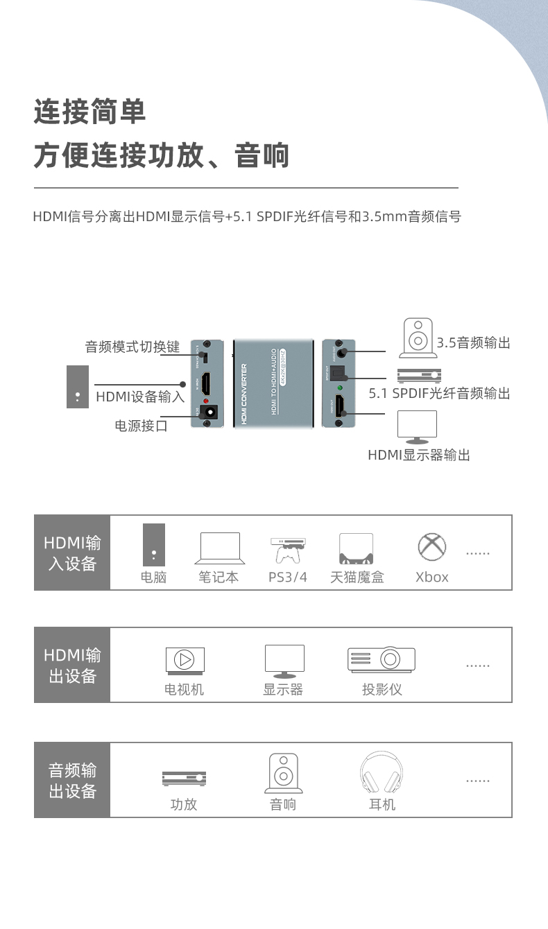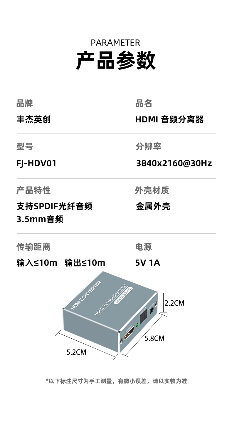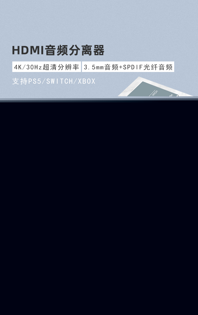 3.HDMI 最高支持分辨率:3840*2160/30HZ 向下兼容多種分辨率 4.HDMI 信號(hào)輸入/輸出 支持線長(zhǎng): 1-10米(視線纜質(zhì)量而定) 5.模擬音頻輸出接口:3.5mm AUDIO OUT