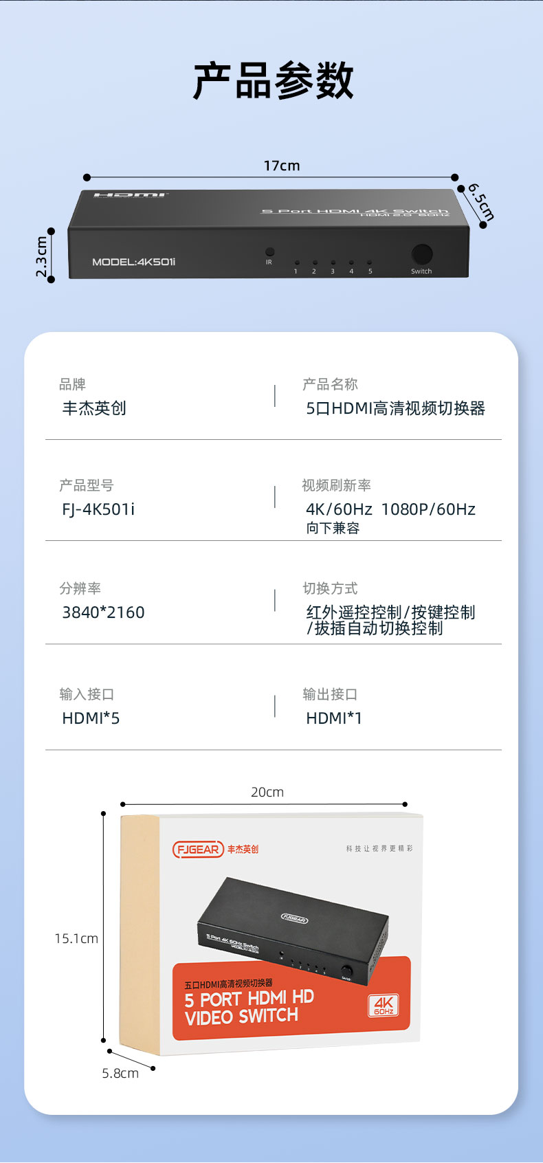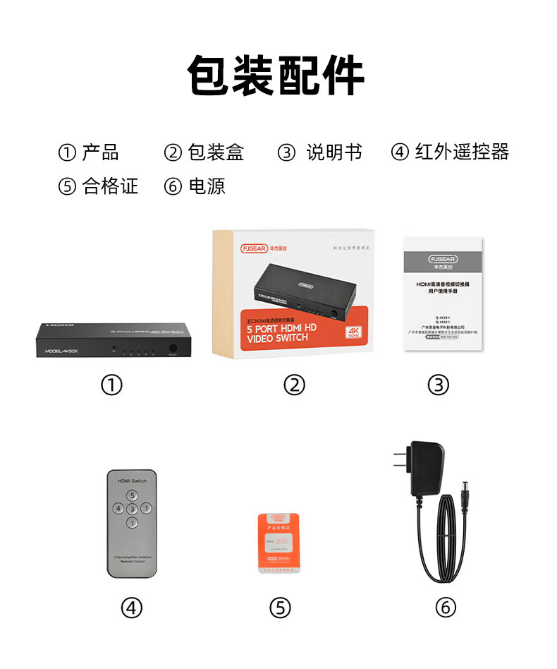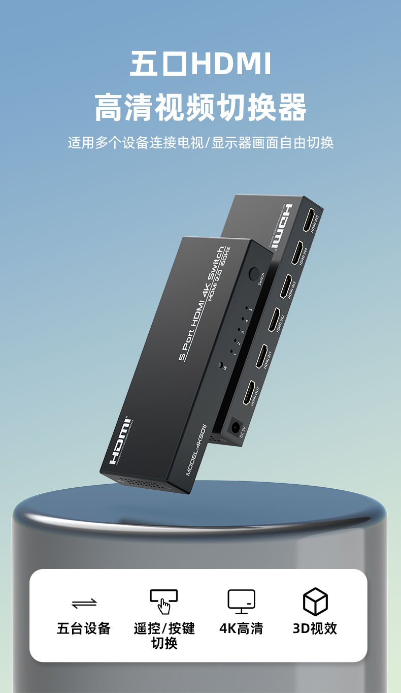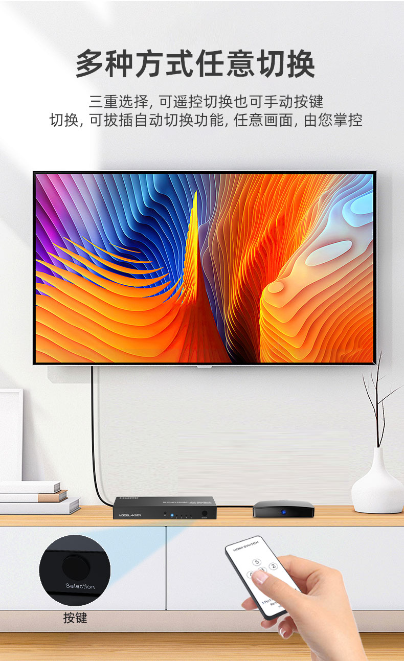 5.切換方式:紅外遙控控制/按鍵控制/拔插自動(dòng)切換控制
