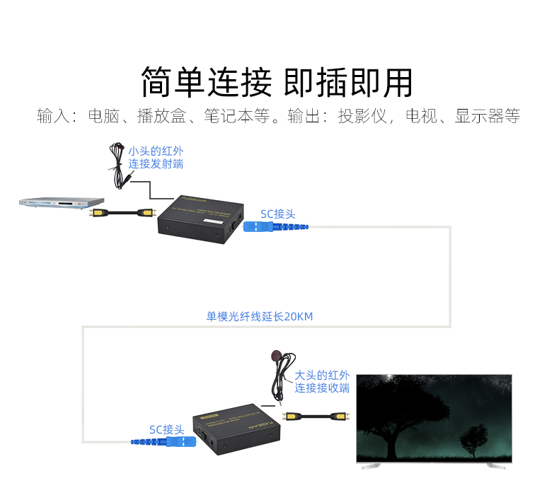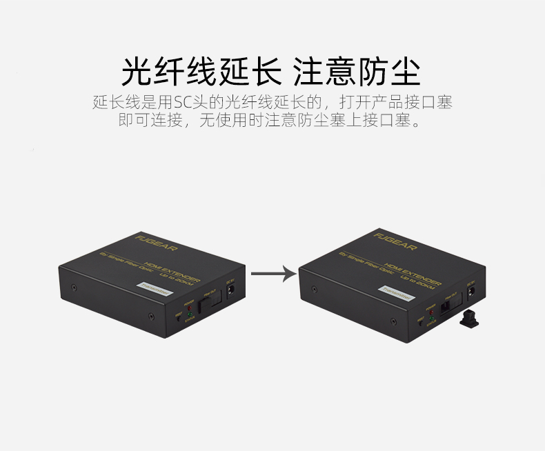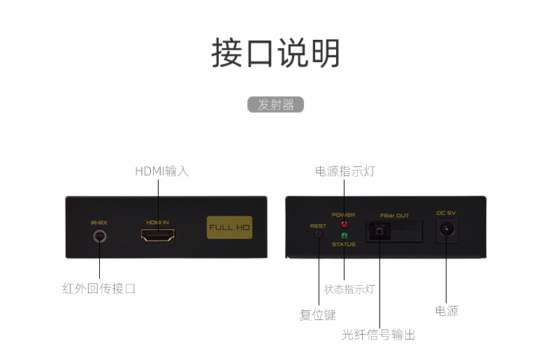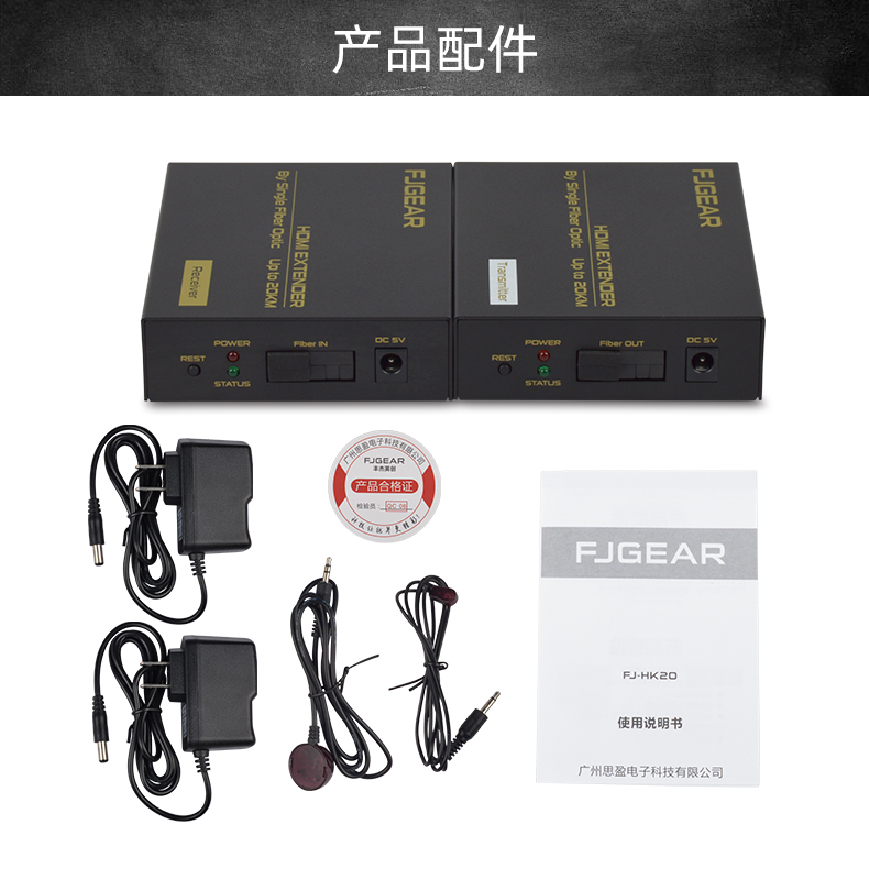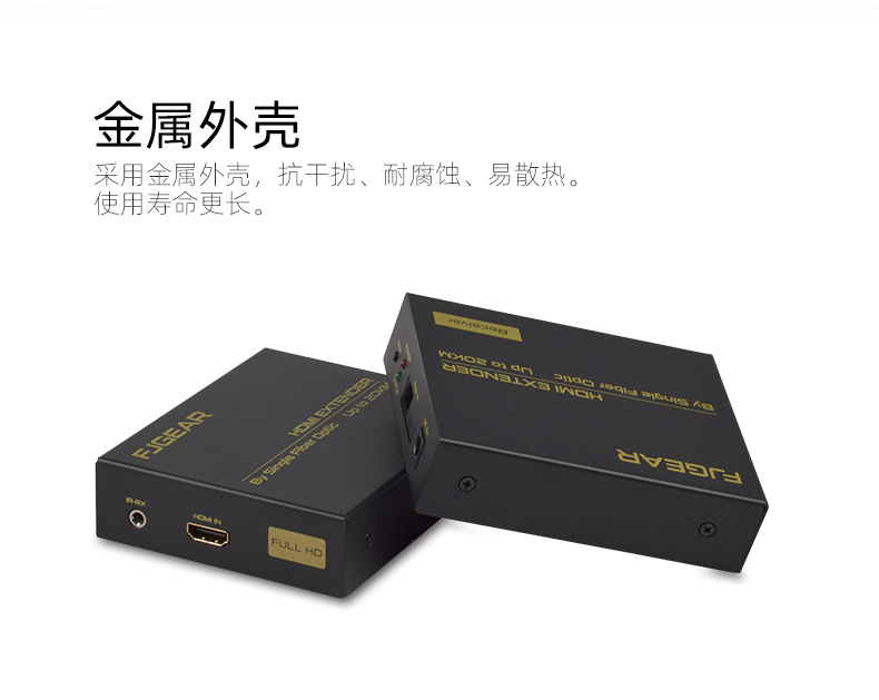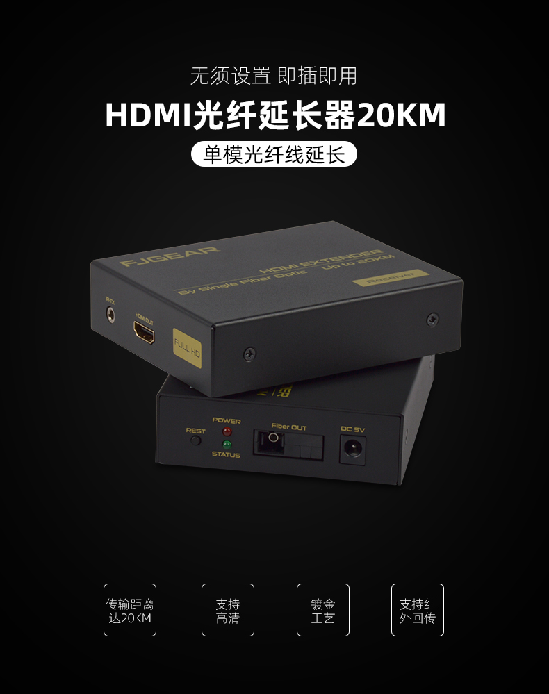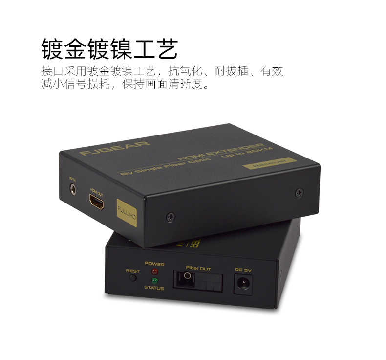 FJ-HK20是一款高清視頻延長器,傳輸介質是單模光纖線;它將一路HDMI高清信號通過一條單模光纖進行傳輸,
