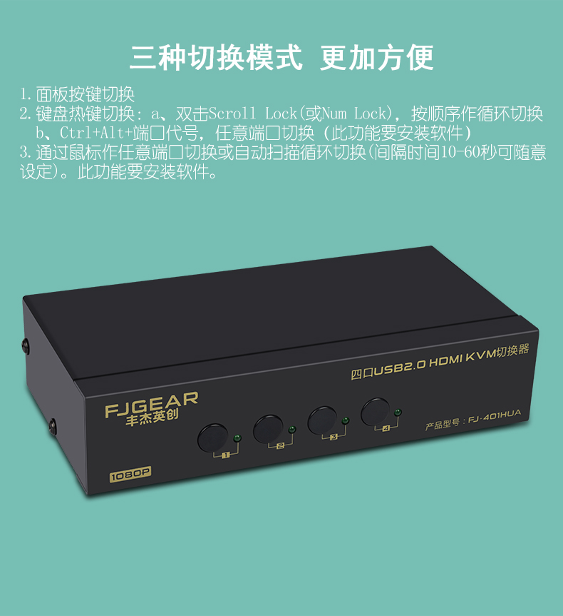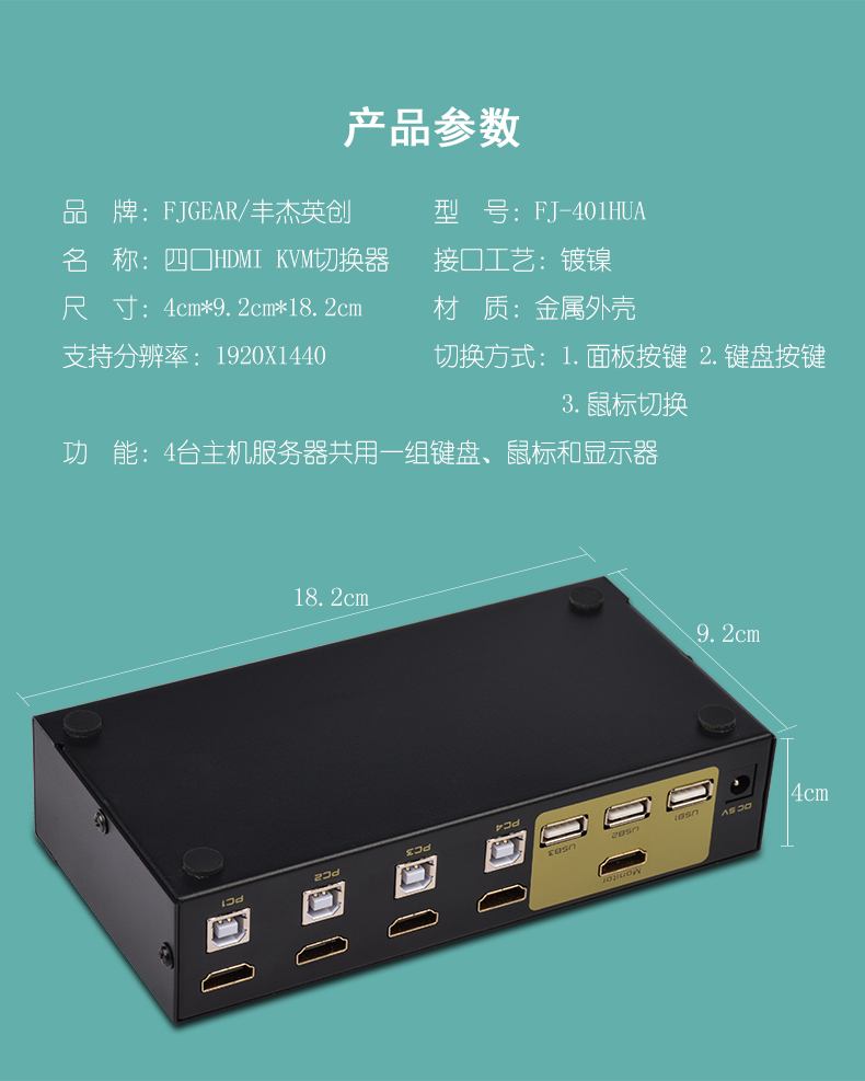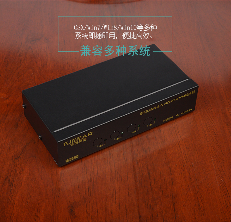 FJ-401HUA整合4端口KVM多電腦切換器,該款產(chǎn)品支持4臺電腦之間或是共它設(shè)備如游戲的HDMI信號切換,并讓使用者從單一控制端分享USB接口設(shè)備FJ-401HUA提供先進的獨立切換功能,使用者可通過前端面板按鍵及鍵盤熱鍵進行功能切換,該款產(chǎn)品同時具備顯示器動態(tài)同步顯示技術(shù),可保持最佳HDMI顯示器顯示分辯率。