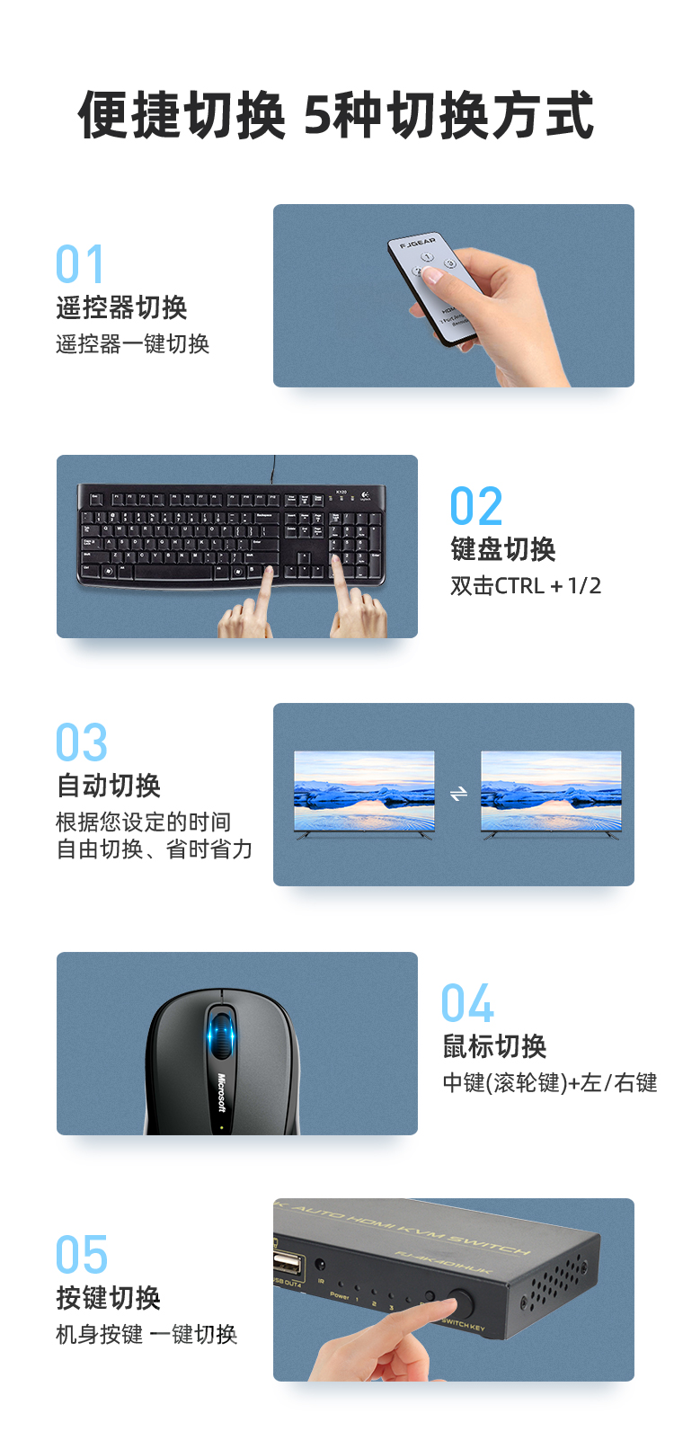 路多功能HDMI KVM切換器,支持4K超清信號傳輸,有4種