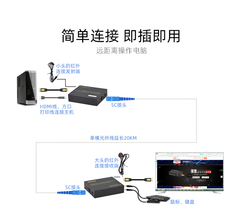 一條單模光纖線(xiàn)進(jìn)行傳輸,最遠(yuǎn)傳輸距離可達(dá)20公里;使用者可以在20公里外通過(guò)鍵鼠即可控制源端設(shè)備,廣泛應(yīng)用于各類(lèi)