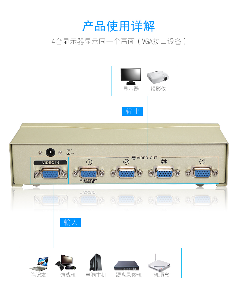 2:該系列VGA分配器有二路、四路、八路等多種端口