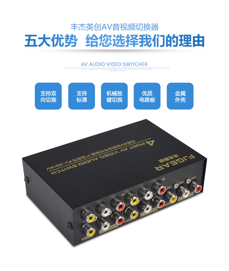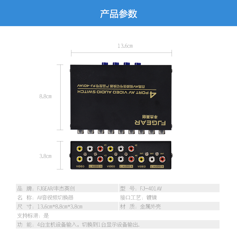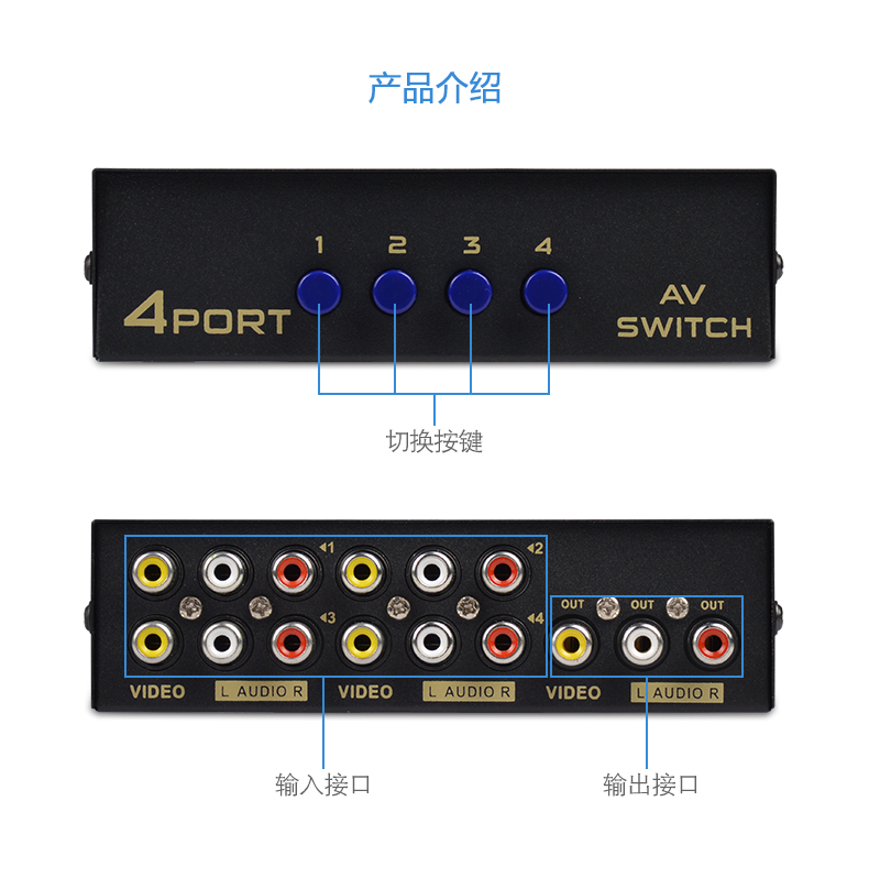 1、4路AV信號(hào)輸入,切換1路AV信號(hào)輸出;