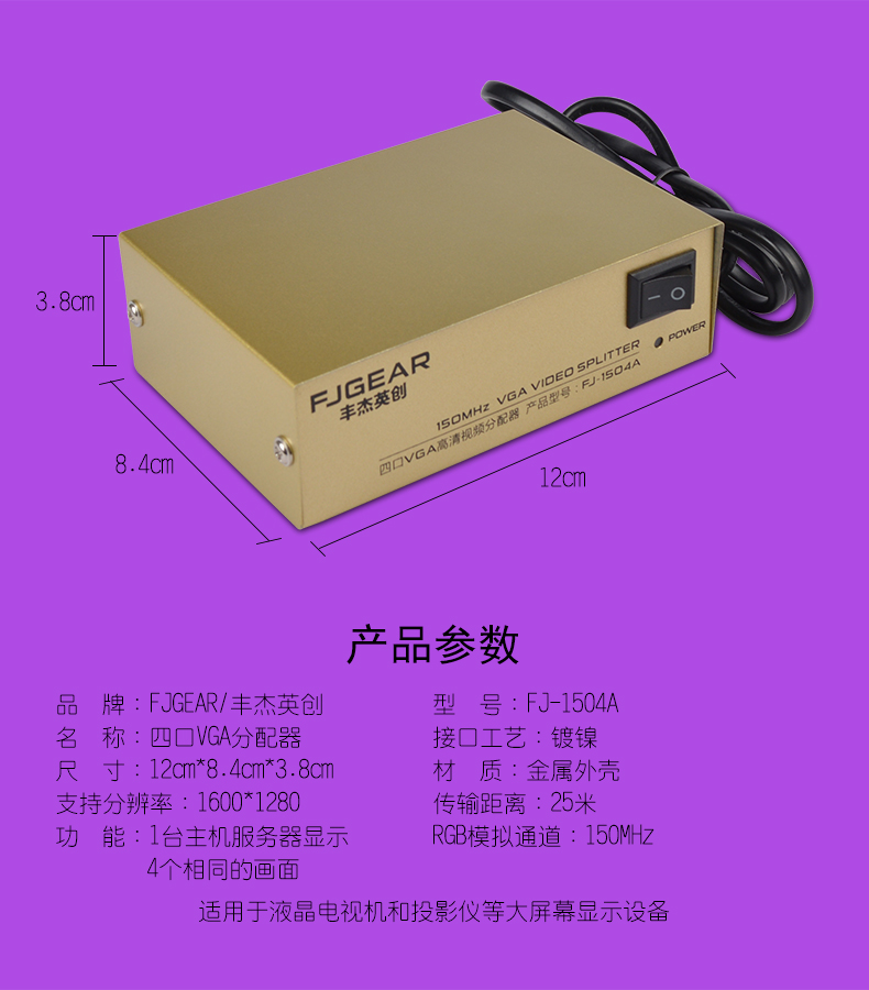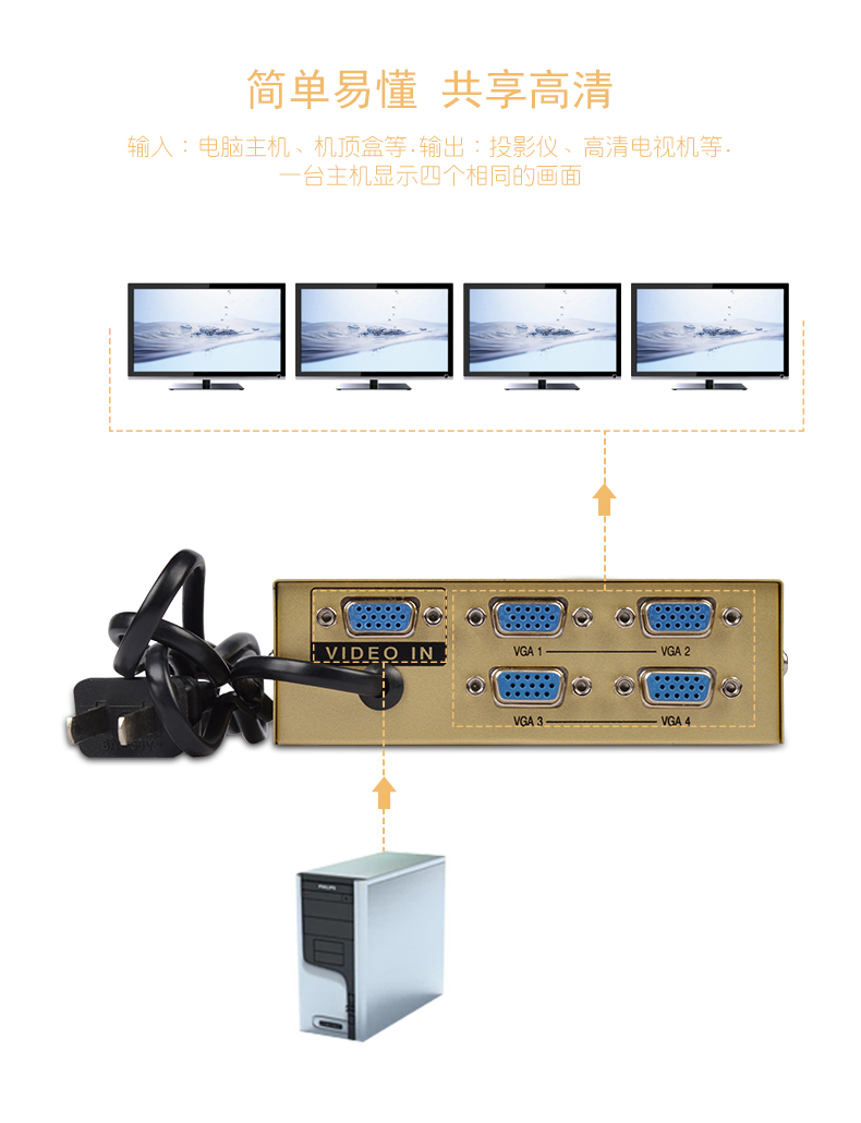 VGA視頻分配器是專業(yè)應(yīng)用于帶有VGA接口的顯示產(chǎn)品(例如:帶VGA輸入接口的電視機(jī)的展示、多媒體教室、電子公告屏、廣告機(jī))的VGA視頻分配等。應(yīng)用于公共視訊系統(tǒng)(證券公司、期貨市場(chǎng)、金融證券等)、視頻會(huì)議系統(tǒng)、廣播電視系統(tǒng)、閉路電視系統(tǒng)、電視監(jiān)控系統(tǒng)、簡(jiǎn)易電腦教學(xué)系統(tǒng)、高品質(zhì)多媒體展示系統(tǒng)、等離子電視機(jī)展示會(huì)場(chǎng)、計(jì)算機(jī)展示會(huì)場(chǎng)的視頻相匹配處理設(shè)備。