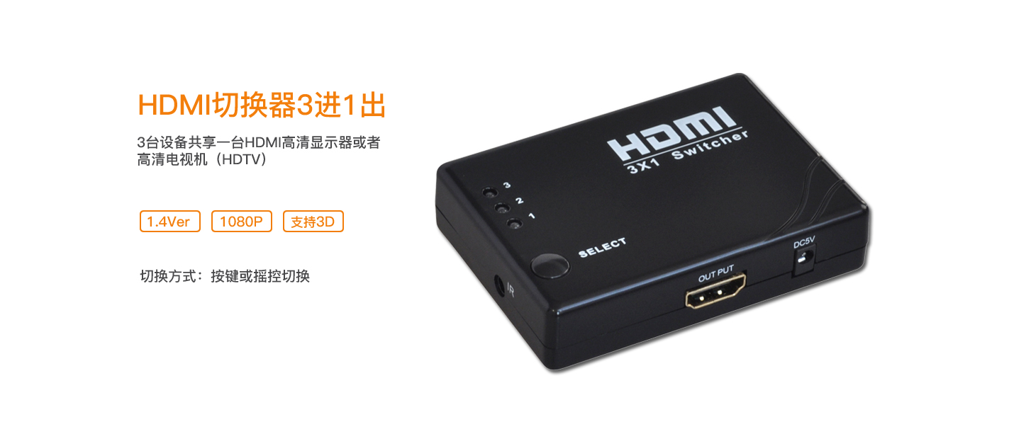 HDMI切換器是將多路HDMI信號(hào)通過切換傳輸給一個(gè)顯示設(shè)備,如兩臺(tái)電腦主機(jī)要共用一個(gè)顯示器,支持多種分辨率到1080p。用戶可以使用一個(gè)接收顯示設(shè)備選擇任意一個(gè)不同的信號(hào)輸入源,用戶可以通過遙控或者手動(dòng)切換信號(hào)源。