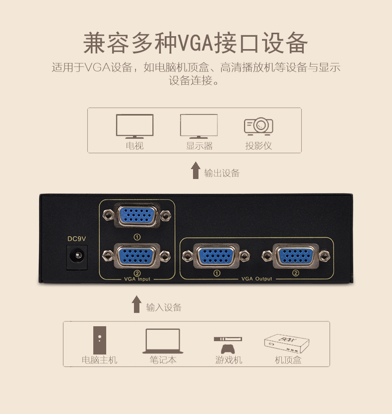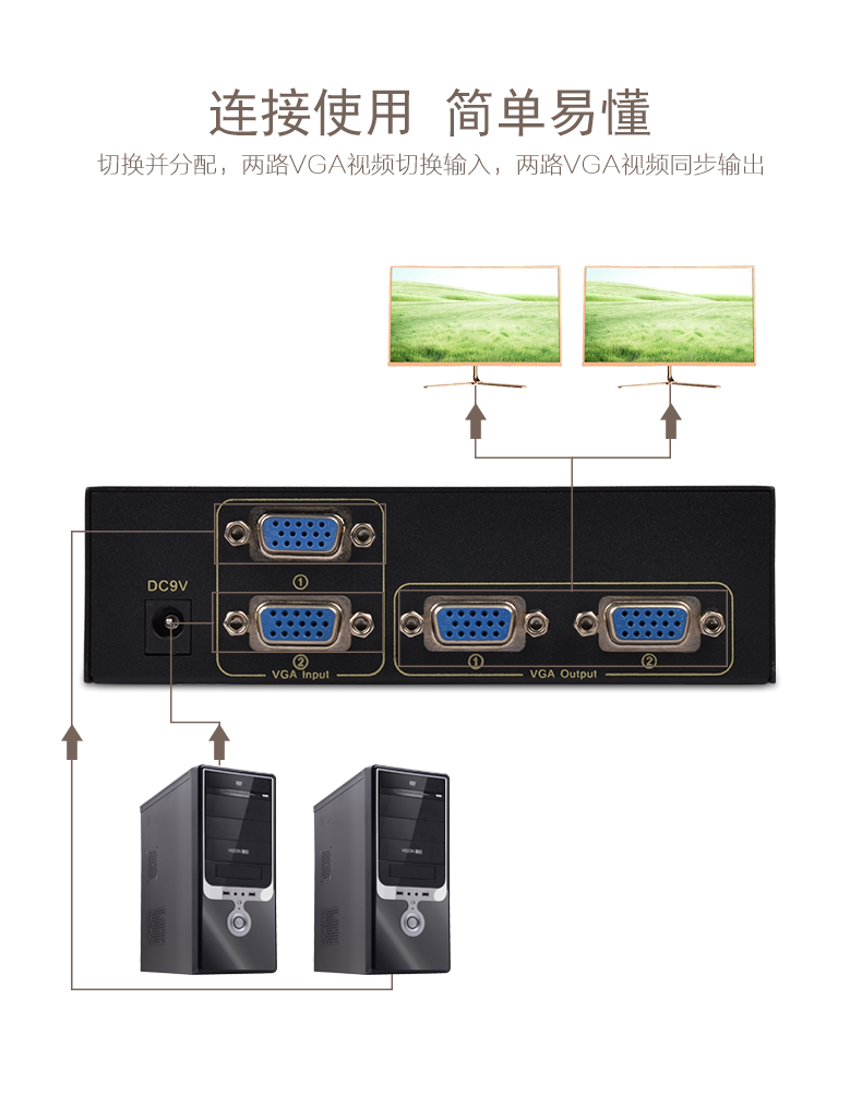 1、二路VGA信號(hào)輸入,二路VGA信號(hào)同步輸出;