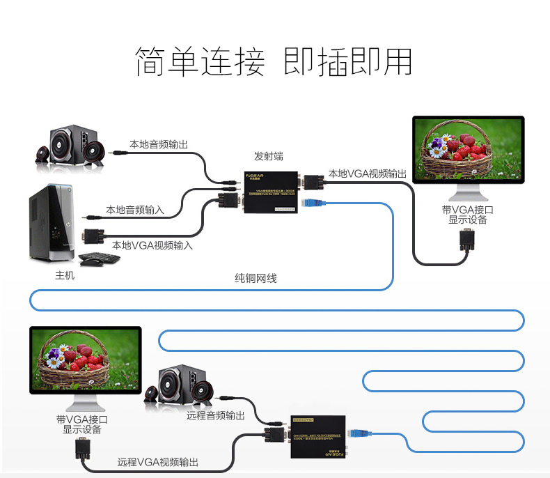 這款帶音頻的VGA延長器是一個適用于本地顯示與遠程顯示的理想設備。VGA與音頻信號可以在本地與遠程同步顯示。
