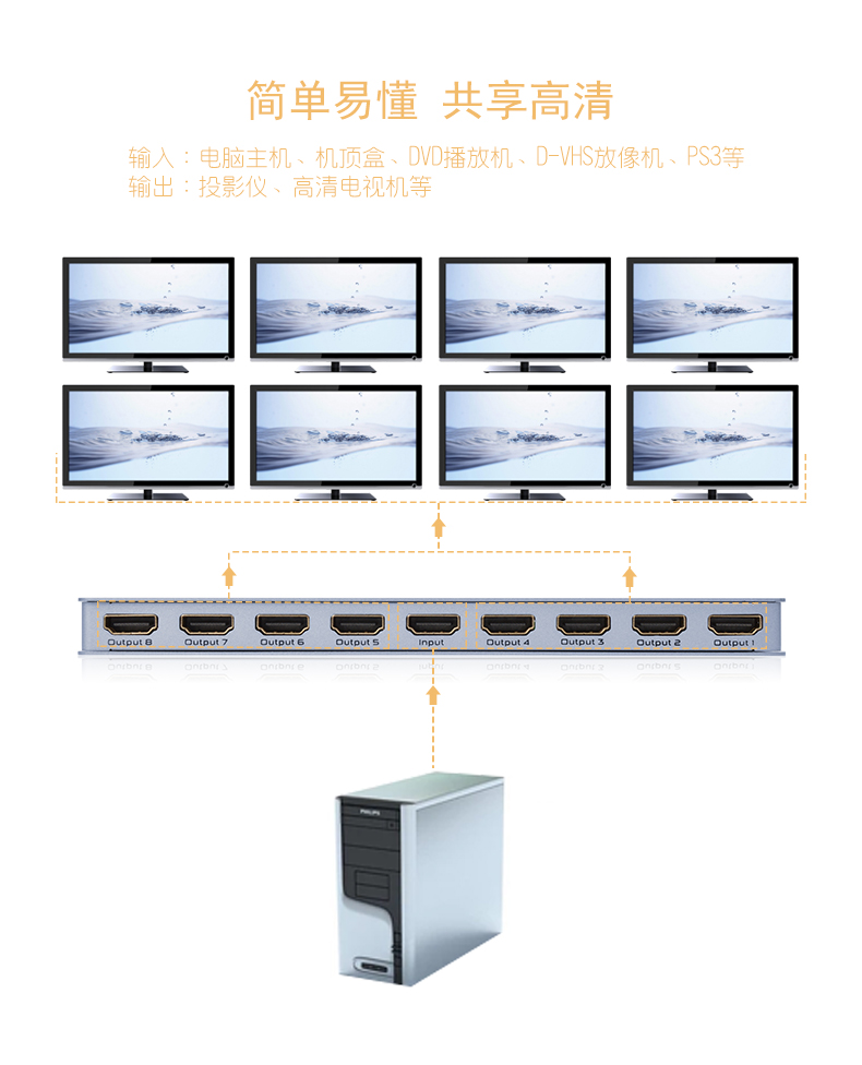 支持藍(lán)光DVD(3D)、網(wǎng)絡(luò)機(jī)頂盒、PC、NOTEBOOK,多媒體播放器,硬盤錄像機(jī)等等各類HDMI接口設(shè)備,帶復(fù)位功能